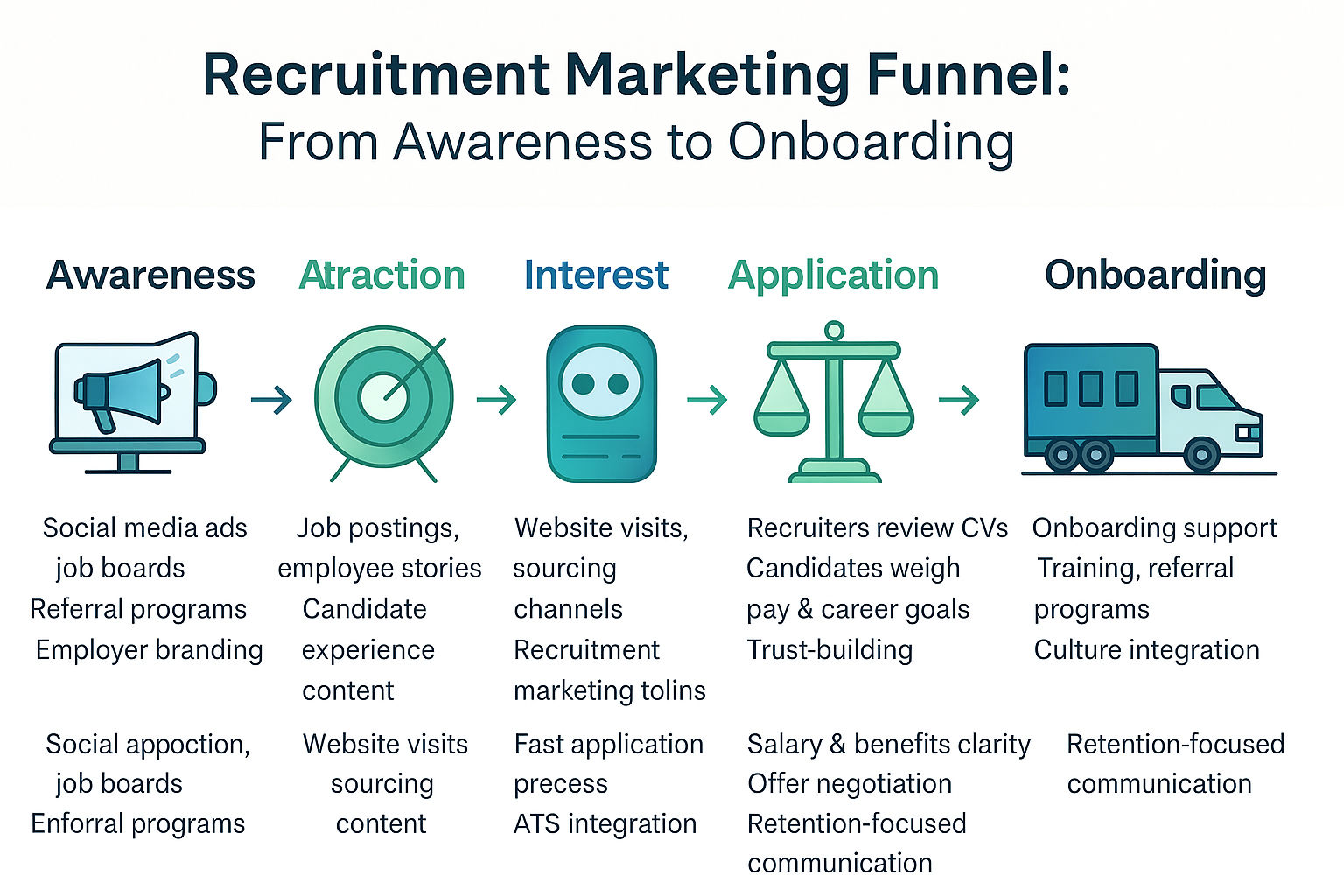 Mastering the recruitment marketing funnel is about the organization turning the hunt for talent into a thought-through strategic process rather than just a one-off action. Each sector pressure from the awareness phase through to the onboarding experience of a candidate needs unique recruitment strategy, superior recruitment, and long-lasting candidate engagement. Focus on standard employer branding, reliable sourcing channels, and simple application procedures.